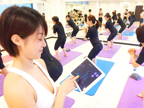 エクササイズの前に少しウォーミングアップをして体をほぐしたあとあちこちにEMSパッドがついているボディスーツに、いよいよ通電します。