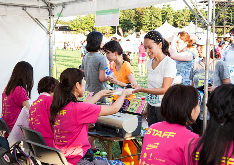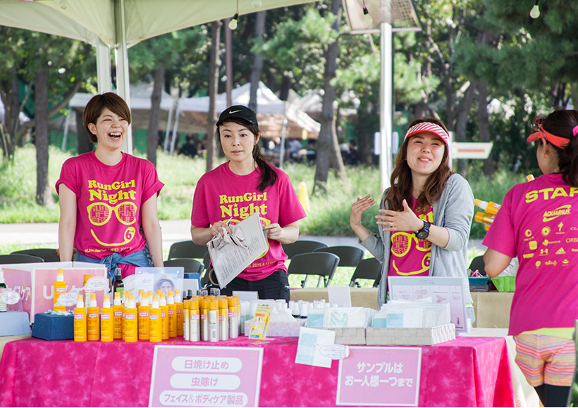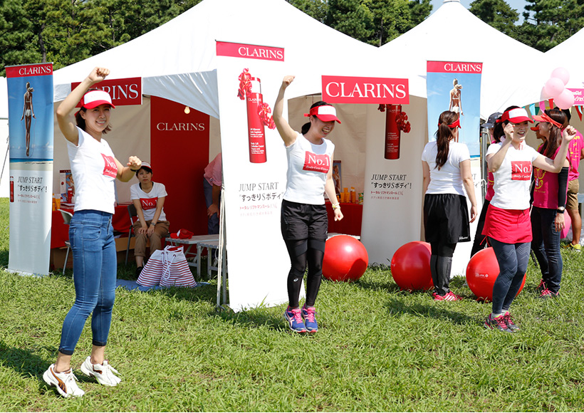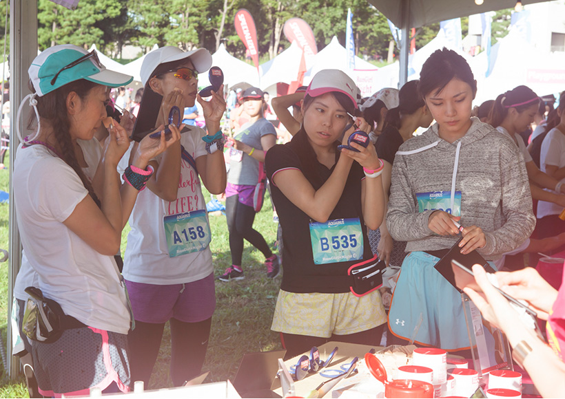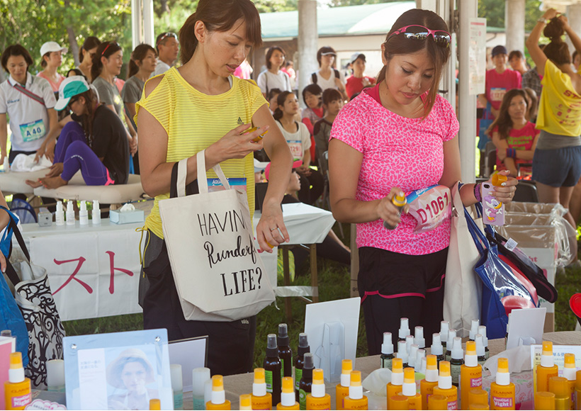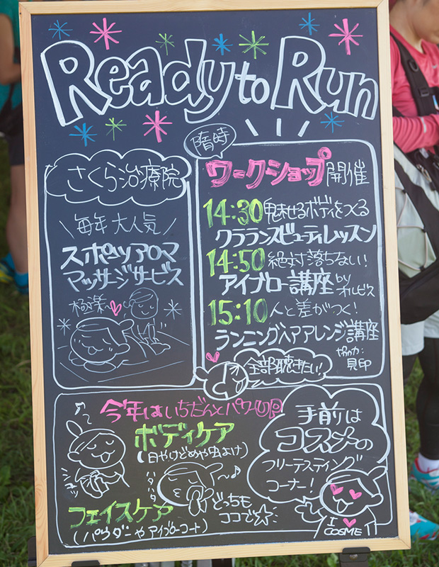 「Ready to Run 」テントでは、日焼け止めや虫除けなど、人気コスメブランドのボディ/フェイスケア製品を多数揃えた無料お試しコーナー、さくら治療院さんによるアロママッサージの無料サービスを実施。また、セルフボディケア、落ちないメイクや崩れないヘアアレンジといった"ラン×ビューティー"の公開ワークショップも開催しました。