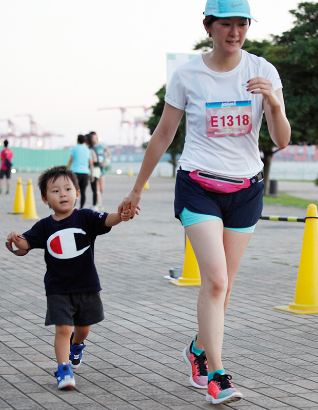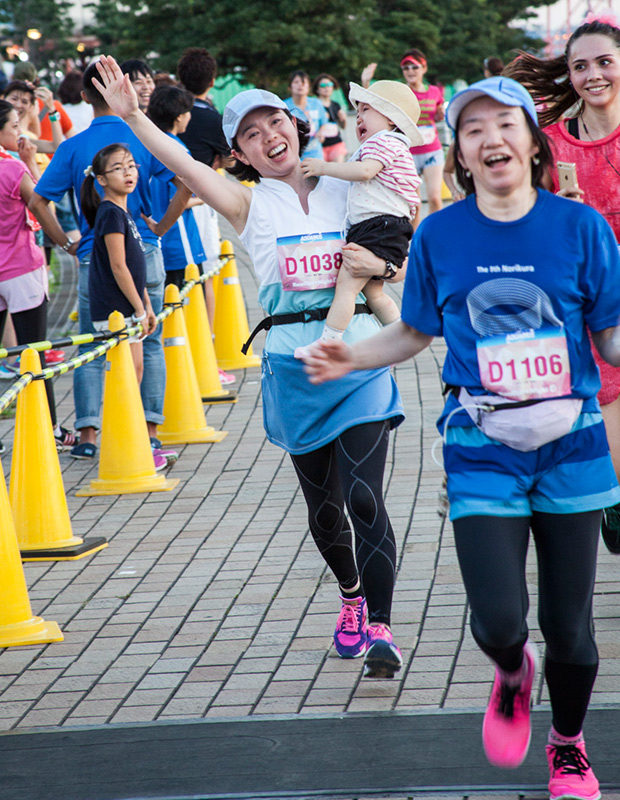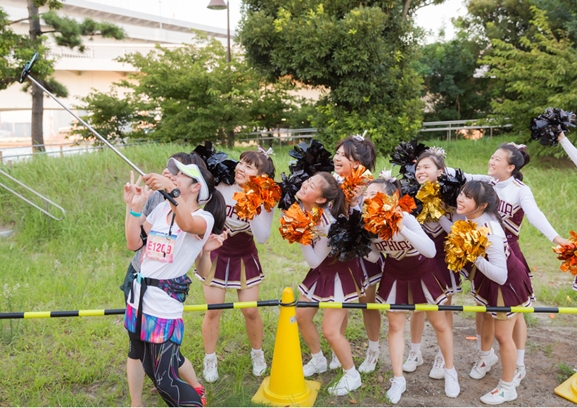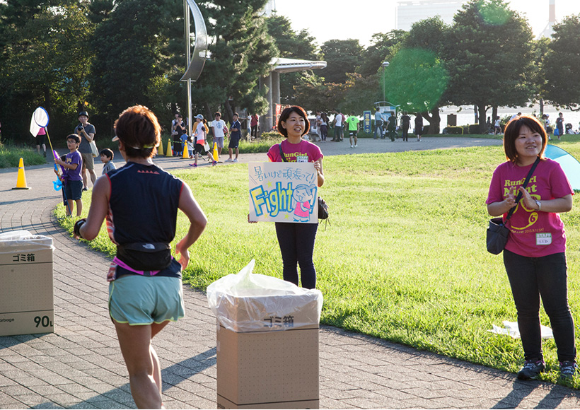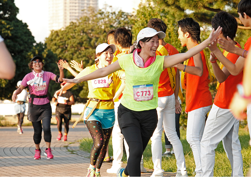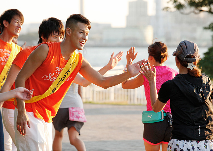 潮風公園からお台場海浜公園へと向かい、レインボーブリッジの眺めを楽しめるお台場らしいコースで、沿道ではフラウ応援団としてSOLIDEMOのメンバーがランナーにハイタッチ、上智大ロリポッパーズによるチアリーディングのアクロバティックなパフォーマンスや、green birdによる給水ボランティアもランナーを後押ししてくれました。